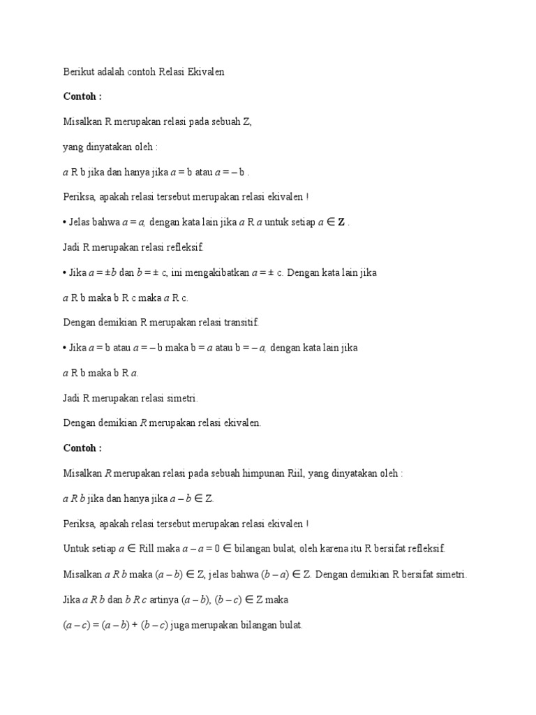 Doc Relasi Ayu Anggraini Academia Edu from 0.academia-photos.com Misalnya untuk 5, 6, dan 7, berlaku 5 < 6, 6 < 7, dan 5 < 7. Sebagai contoh, relasi dua transitif. Jika $latex r$ adalah suatu relasi dan. Video ini menjelaskan relasi ekuivalensi dan bagaimana cara menguji suatu relasi apakah relasi tersebut merupakan relasi ekuvalensi atau bukan. Contoh 2 dalam contoh 4, apakah kelas ekivalen dari kata tikus, yang dinotasikan dengan tikus ? Sebelum memahami pengertian fungsi perlu dijelaskan terlebih dahulu tentang pengertian relasi. Untuk sifat simetri, terdapat dua kemungkinan: Cara mudah untuk mengerjakan soal relasi dan fungsi serta perbadaanya tentunya wajib mengetahui materi ini sejak dari awal.